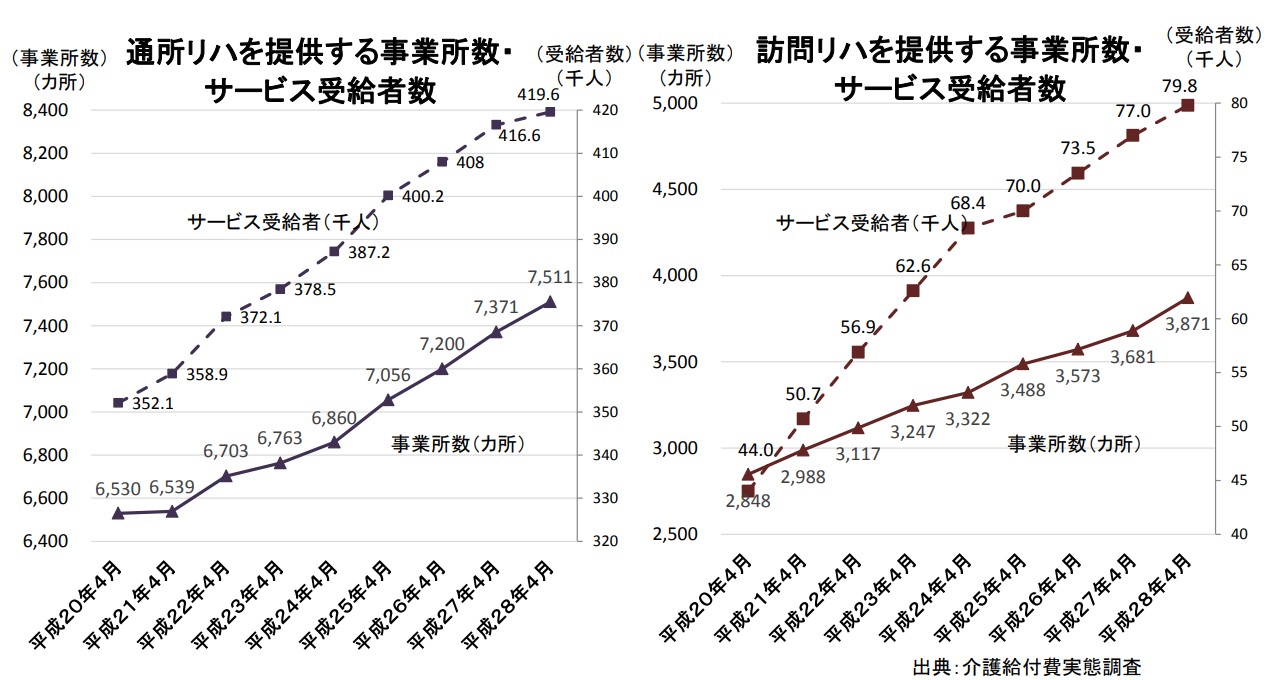 厚生労働省の資料によれば、2008年から2016年までの間に通所・訪問リハビリテーションを提供する事業所数や受給者数が増加しています。